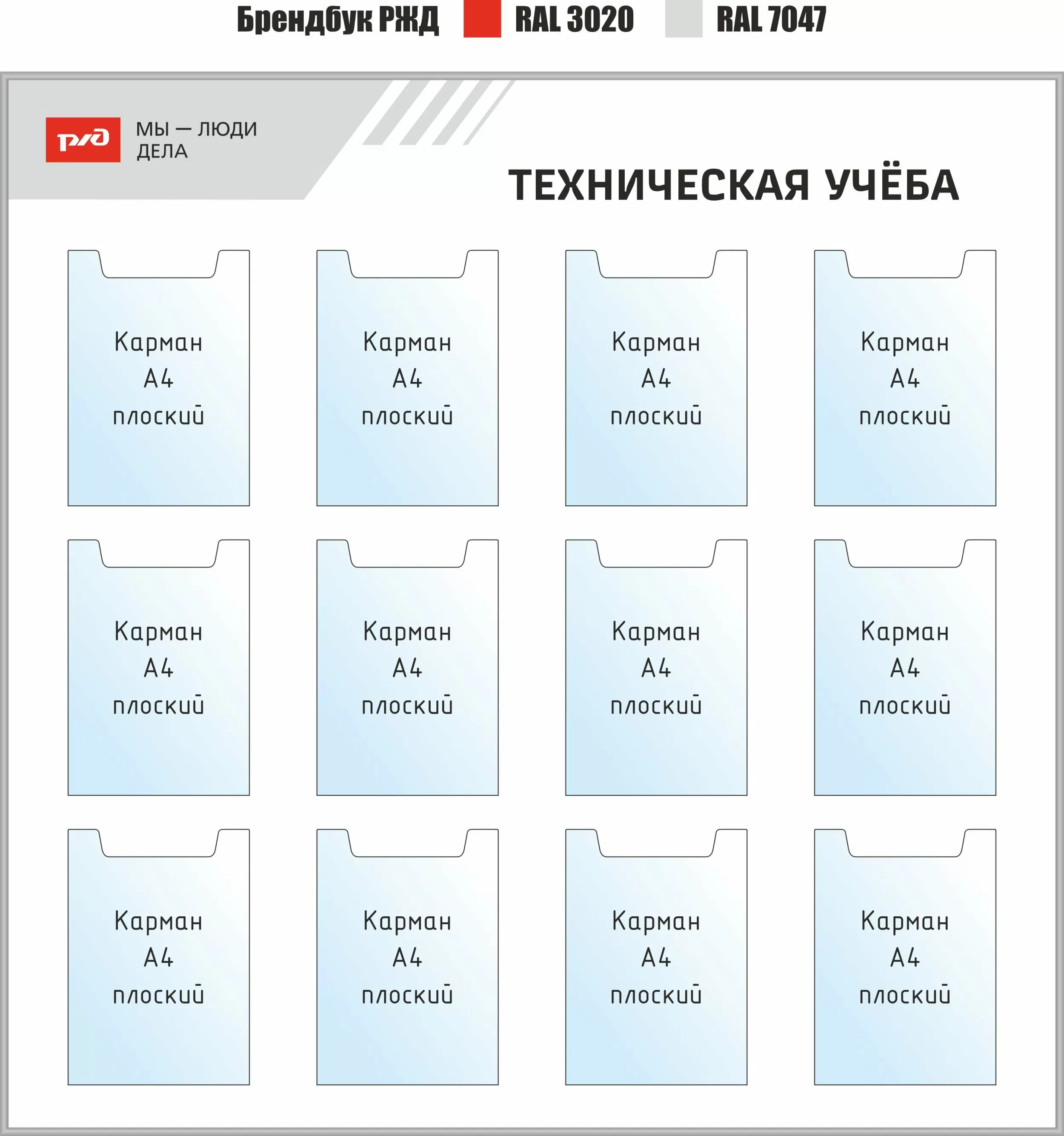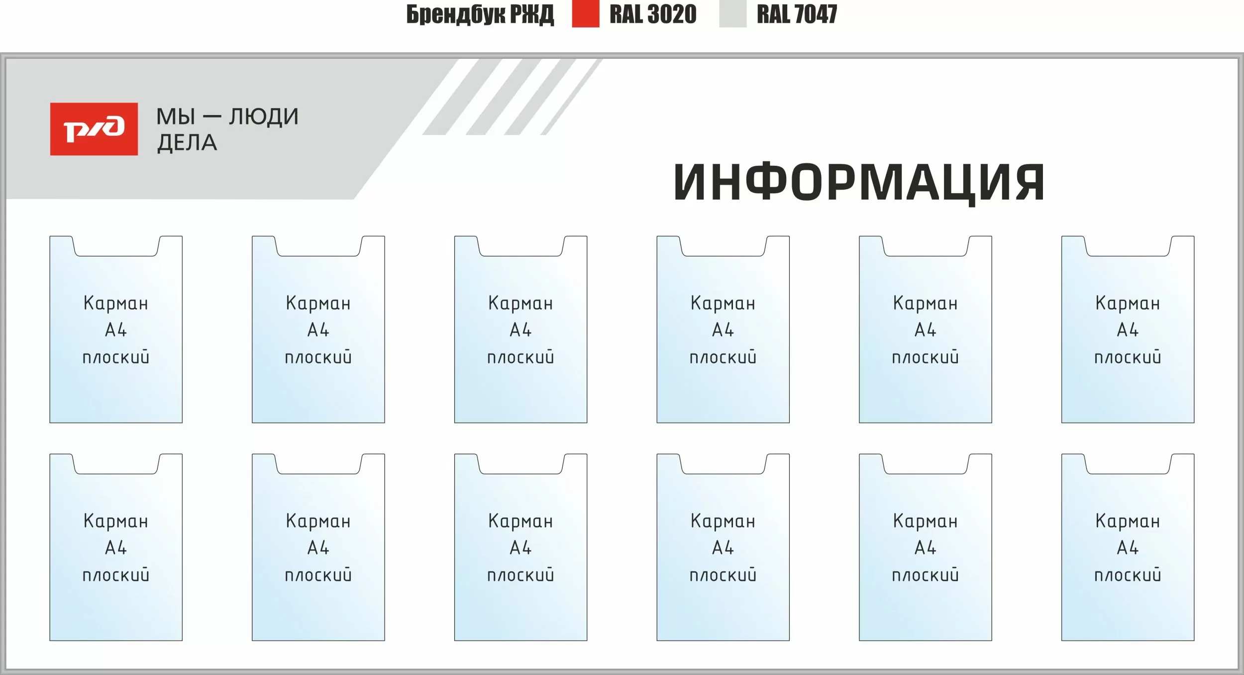 Наша компания более 20 лет мы работает с железнодорожной отраслью как надёжный поставщик и производитель. Для нас особенно ценны проекты, выходящие за рамки стандартных заказов и становящиеся частью корпоративной культуры крупнейшего работодателя страны. Недавно мы завершили поставку серии информационных стендов для объектов ПАО «РЖД», выполненных в единой концепции бренда работодателя — «Мы — люди дела». Это не просто обновление оформления: мы воплотили ценности уважения к профессионалу в повседневную рабочую среду.О концепции